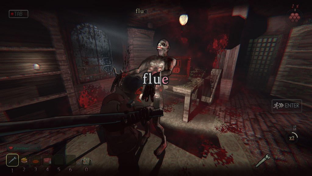 I’m not a particularly big fan of horror games. Nor am I at all notable in regards to my typing speed. Yet somehow, these two facts made me feel like the perfect participant in this experience. I chose to play at the game’s normal difficulty, and at the typing difficulty suggested for my WPM. This simple design decision to split these two forms of difficulty allows this game to be simultaneously accessible yet still challenging for a wider audience. Are you an adrenaline junkie who only has a familiarity with console controllers? Crank up the game difficulty, but keep the words simpler and shorter. Perhaps you’re a scaredy-cat, who also happens to be a world-class data-entrist? May I suggest the “grandmaster” typing difficulty to handicap you with longer and stranger words, while selecting easy on the other.