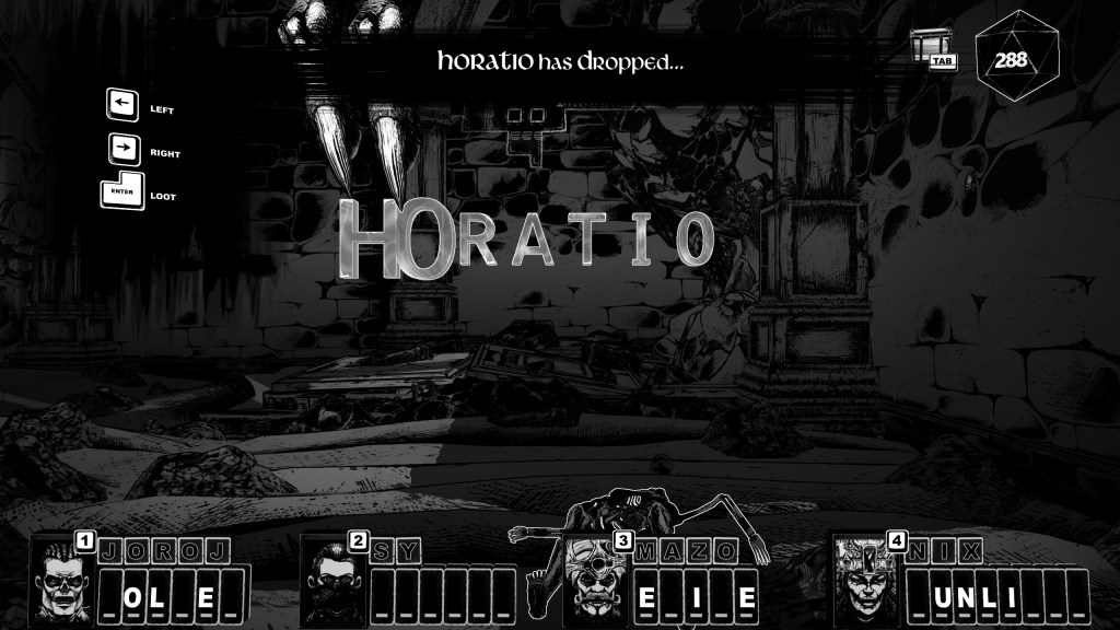 You can earn the aforementioned letters for this system in a myriad of ways, but my personal favourite is by opening chests. When you find one, you don’t gain an item or fistful of gold. In fact you don’t even see it’s contents. Instead you play a shortened game of twenty questions with the titular Cryptmaster, the necromancer responsible for your shambling. In order to gain information about it, you must ask him to interact with it in some way. “Look at it. Touch it. Taste it. Wear it?” The responses to these odd orders will hopefully elucidate you on the identity of this item, and if you guess correctly you are rewarded with the letters that make up its name, which then fill in occurrences in your team’s current words. I would honestly play this title solely based on the fact that I can ask a skeleton wizard what a mirror tastes like. If you too are excited at the prospect of bothering a poor bony arcanist, while interacting with the most mechanically unique interpretation of a dungeon crawler around, then I believe you know what to do. I also think we should consider therapy.