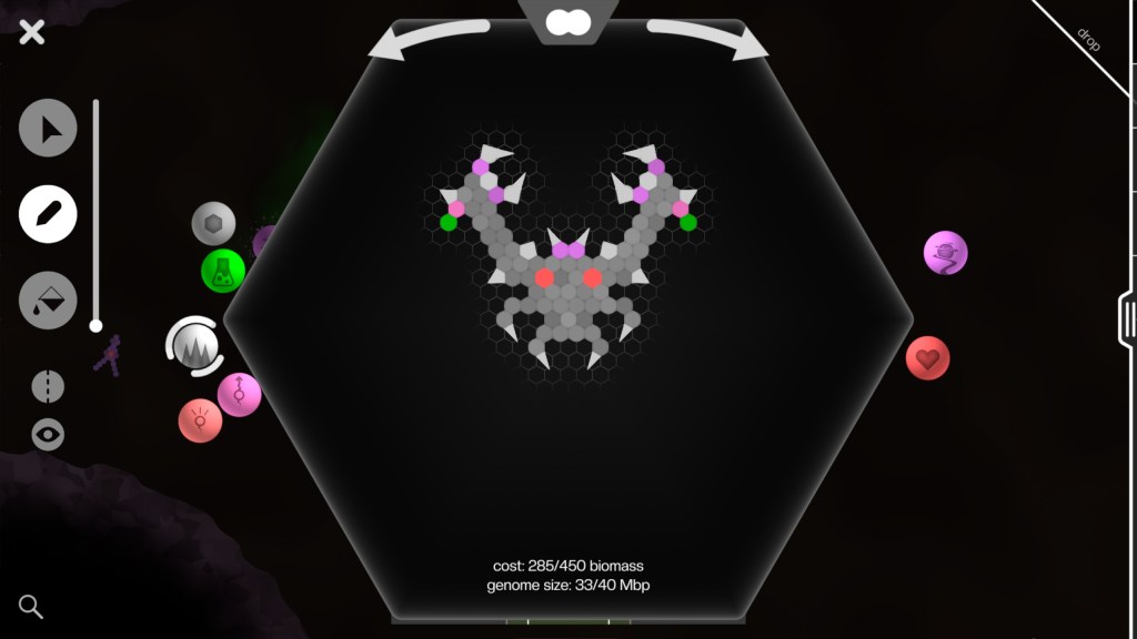At any time, regardless of the obvious danger that surrounds you, you may open the design canvas for your creature. On a blank hexagonal grid you paint the shape and features of your new species, your colours representing the different types of cells you have acquired. Initially only basic concepts will make sense in this strange new art form, such as special cells requiring a power source in order to activate their corresponding ability.